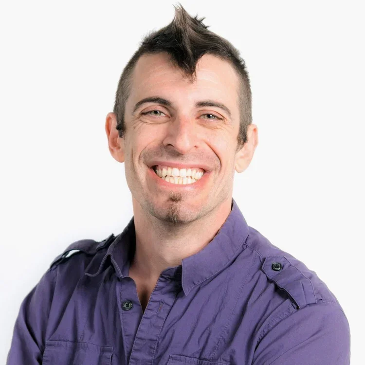 • A smiling man with spiked hair wearing a purple shirt against a white background.