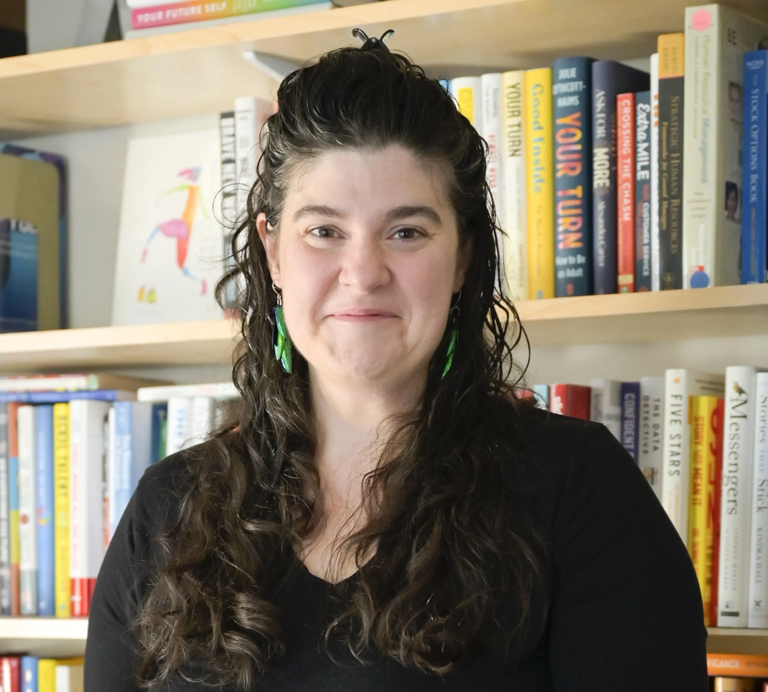 • A woman with dark, wavy hair and green earrings, standing in front of a bookshelf filled with colorful books.